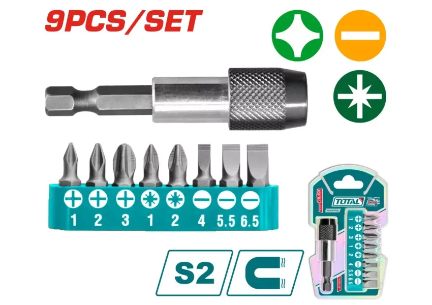 Հավաքածուն ներառում է 9 հատ մագնիսական բիթ և 1 հատ բիթերի բռնիչ։ Պատրաստված են բարձրորակ նյութերից՝ տարբեր տեսակի ամրացման աշխատանքների համար։