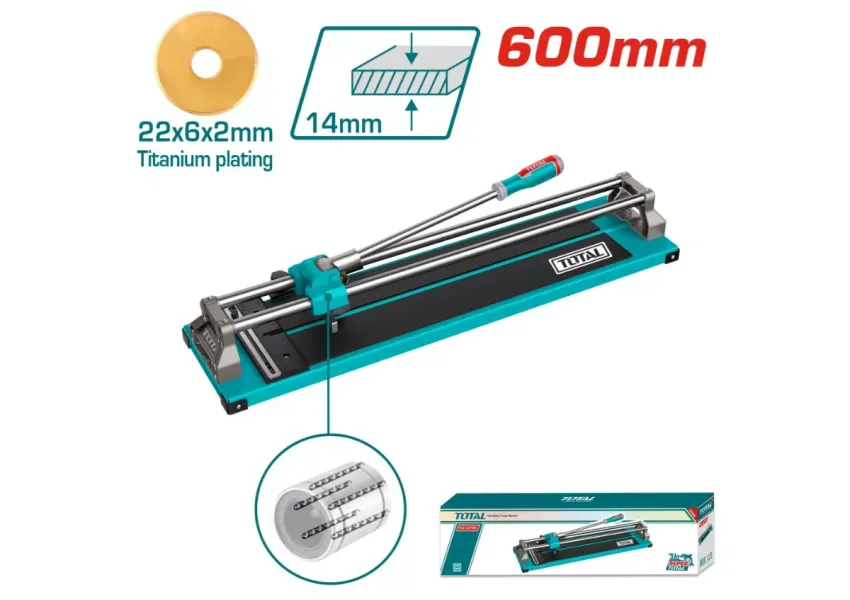 TOTAL THT576002 սալիկ կտրող գործիք է՝ նախատեսված ինչպես մասնագիտական, այնպես էլ կենցաղային օգտագործման համար։ Կարող է կատարել մինչև 600մմ երկարությամբ սալիկների ուղիղ և անկյունային կտրում։ Գործիքը համալրված է ամուր վոլֆրամի կարբիդային անիվով, որն ապահովում է կտրման ավելի մեծ ճշգրտությունը։ Գործիքի հիմքը նախագծված է սահումից պաշտպանող մակերեսով՝ աշխատանքի անվտանգության բարձրացման համար։ Հարմար է կերամիկական և կերամոգրանիտից սալիկների կտրատման համար՝ ապահովելով սահուն և արդյունավետ կտրում։