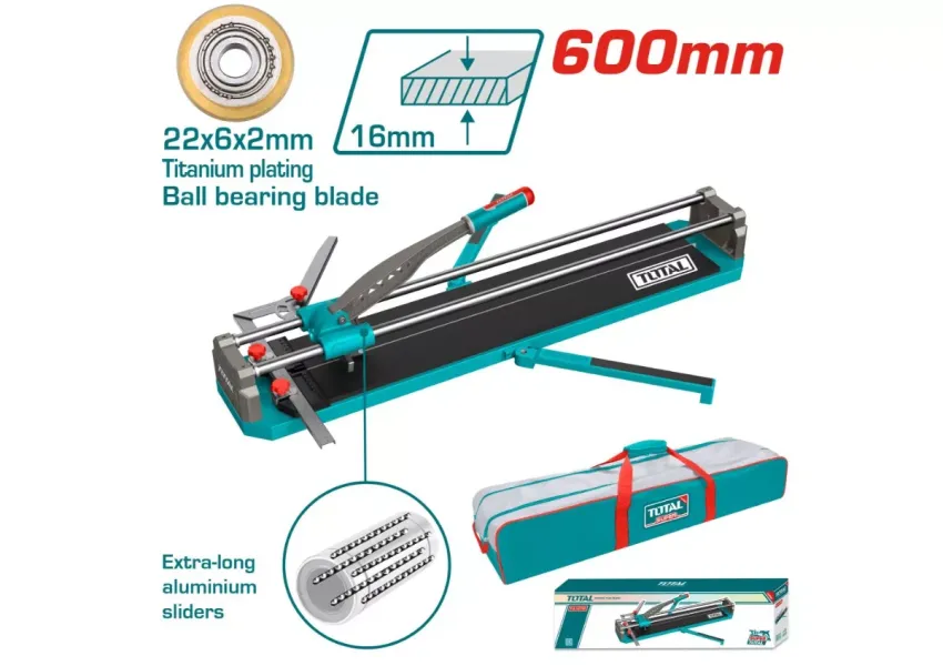 TOTAL THT576003 սալիկ կտրող գործիք է՝ նախատեսված ինչպես մասնագիտական, այնպես էլ կենցաղային օգտագործման համար։ Կարող է կատարել մինչև 600մմ երկարությամբ սալիկների ուղիղ և անկյունային կտրում։ Գործիքը համալրված է ամուր վոլֆրամի կարբիդային անիվով, որն ապահովում է կտրման ավելի մեծ ճշգրտությունը։ Գործիքի հիմքը նախագծված է սահումից պաշտպանող մակերեսով՝ աշխատանքի անվտանգության բարձրացման համար։ Հարմար է կերամիկական և կերամոգրանիտից սալիկների կտրատման համար՝ ապահովելով սահուն և արդյունավետ կտրում։