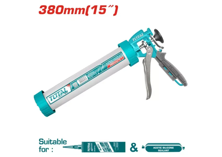 TOTAL THT20115 սիլիկոնի ատրճանակը ալյումինե գործիք է՝ 380 մմ երկարությամբ, ամուր բռնակով: Հարմար է տարբեր հերմետիկ նյութերի օգտագործման համար: Ապահովում է հերմետիկ նյութի հավասարաչափ կիրառումը: