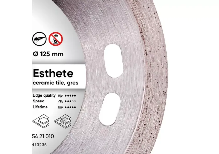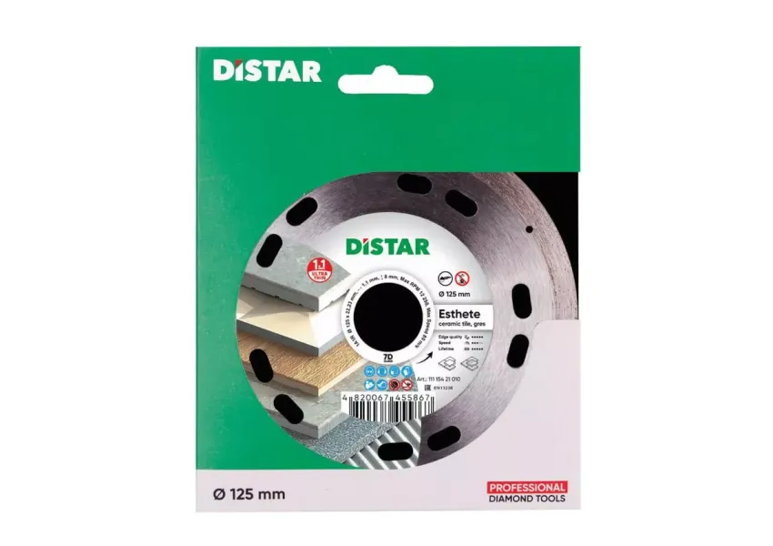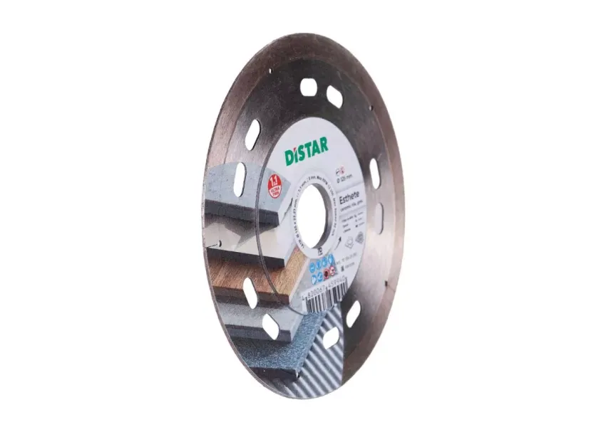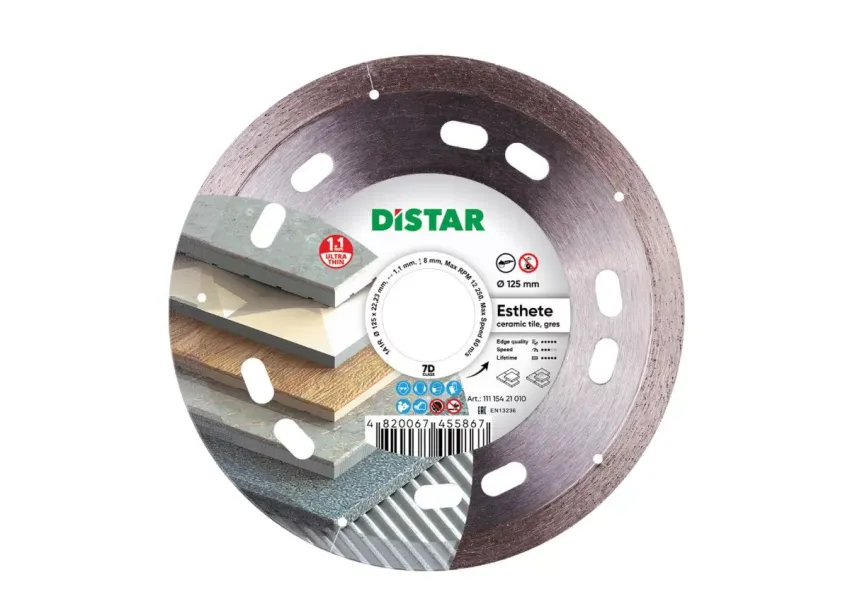 Distar 1A1R Esthete սկավառակը կիրառվում է դեկորատիվ ծածկույթով կերամիկական նյութերի կտրման համար։ Հագեցած է 1․1մմ գերբարակ ալմաստային շերտով, ինչի շնորհիվ հնարավոր է կատարել նույնիսկ փափուկ գլազուրային ծածկույթով սալիկների կտրում։