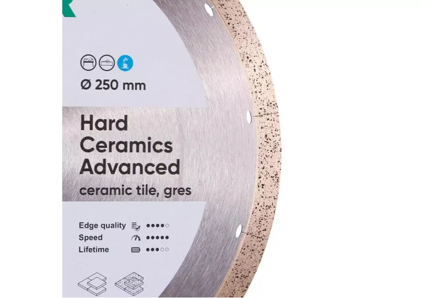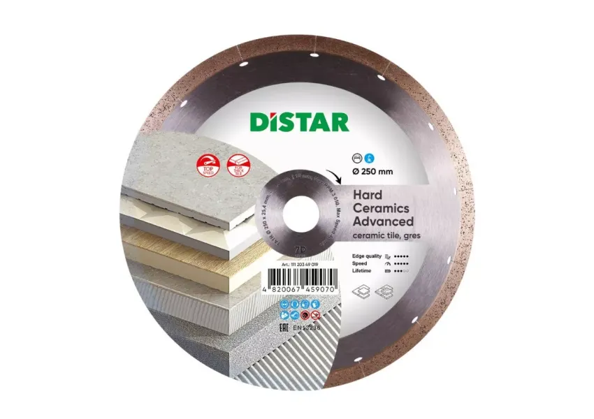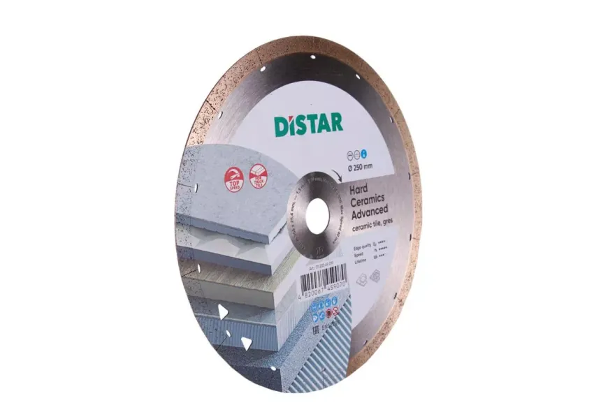 Distar Hard Ceramics Advanced սկավառակը կիրառվում է կերամոգրանիտի, ամուր կերամիկական սալիկների արագ կտրման աշխատանքներում։ Սկավառակի ալմաստե շերտում ներառված են գրաֆիտե չիպսեր, որոնք ձևավորում են սպունգանման կառուցվածք՝ հանդես գալով որպես ամուր քսուք։ Ալմաստե շերտը ենթարկված է լազերային սեգմենտավորման, որը նվազեցնում է ջերմային ներազդեցությունները։