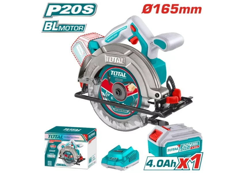 TOTAL TSLI16521 մարտկոցային սղոցը հարմար է մետաղի, փայտի ուղիղ և անկյունային կտրման համար։ Փաթեթում՝ 1 հատ 165մմ սկավառակ, 1 հատ 4․0Աժ մարտկոց (TFBLI20021), 1 հատ լիցքավորիչ (TFCLI2001):