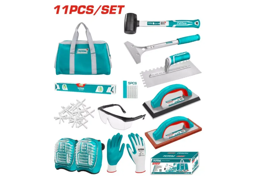 Սալիկապատողի համար անհրաժեշտ գործիքներն ու պարագաները՝ մեկ հավաքածուի մեջ։ Ներառված է․ - 1 հատ ռետինե մուրճ (220գր) - 1 հատ մետաղի քերիչ՝ 5 հատ SK5 սայրով, - 1 հատ 280x130մմ մալա՝ սալիկի սոսնձի համար, - 1 հատ 240x100մմ ռետինե հղկիչ - 1 հատ 230x100մմ հղկիչ՝ բարակ ռետինե հիմքով, - 1 հատ հարթաչափ (40սմ), - 1 հատ պաշտպանիչ ակնոց, - 1 զույգ նիտրիլային ձեռնոցներ, - 1 զույգ ծնկադիրներ - 250 հատ սալիկի կտիչ։ Հարմարավետության համար հավաքածուն փաթեթավորված է կտորից պայուսակում։