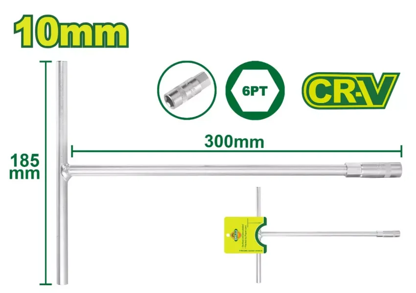 T-աձև բանալին պատրաստված է քրոմ-վանադիումային պողպատից։ Չափը՝ 10մմ։ Երկարությունը՝ 185x300մմ։