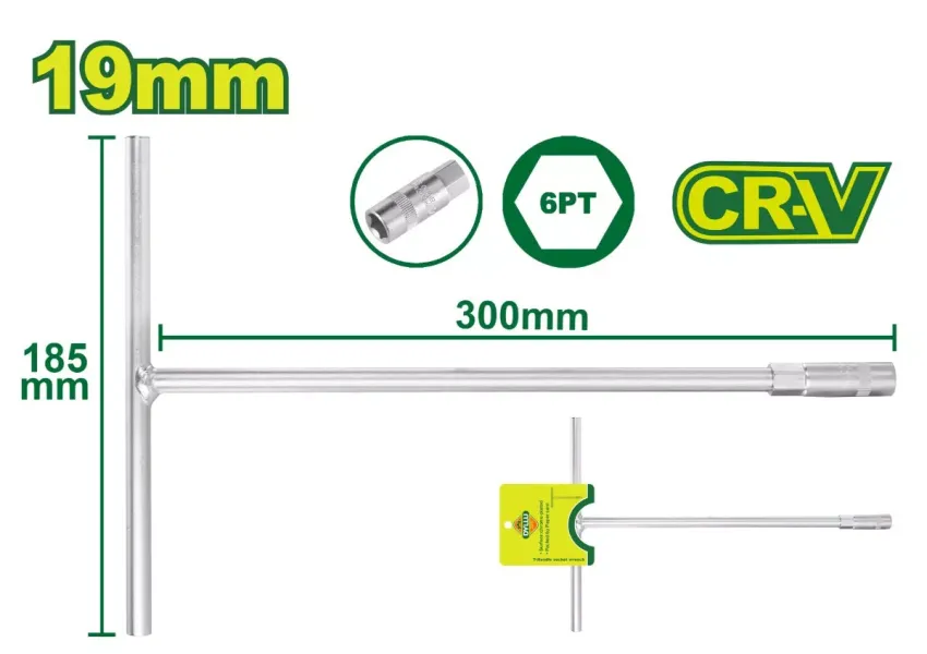 T-աձև բանալին պատրաստված է քրոմ-վանադիումային պողպատից։ Չափը՝ 19մմ։ Երկարությունը՝ 185x300մմ։