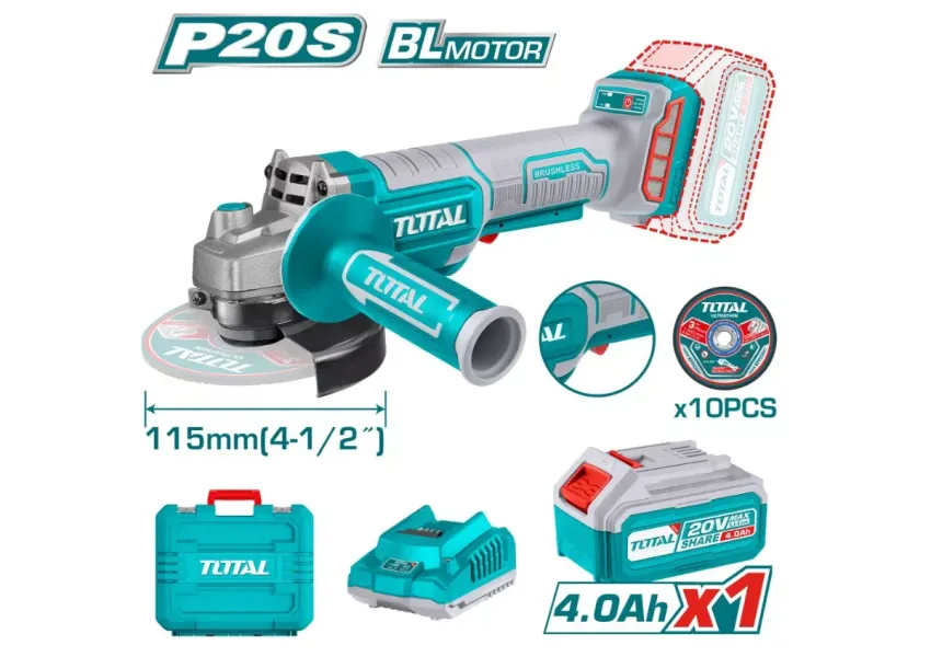 Թեթև և հզոր անլար TOTAL անկյունային հղկման մեքենան նախատեսված է տարբեր նյութեր կտրելու և հղկելու աշխատանքների համար։