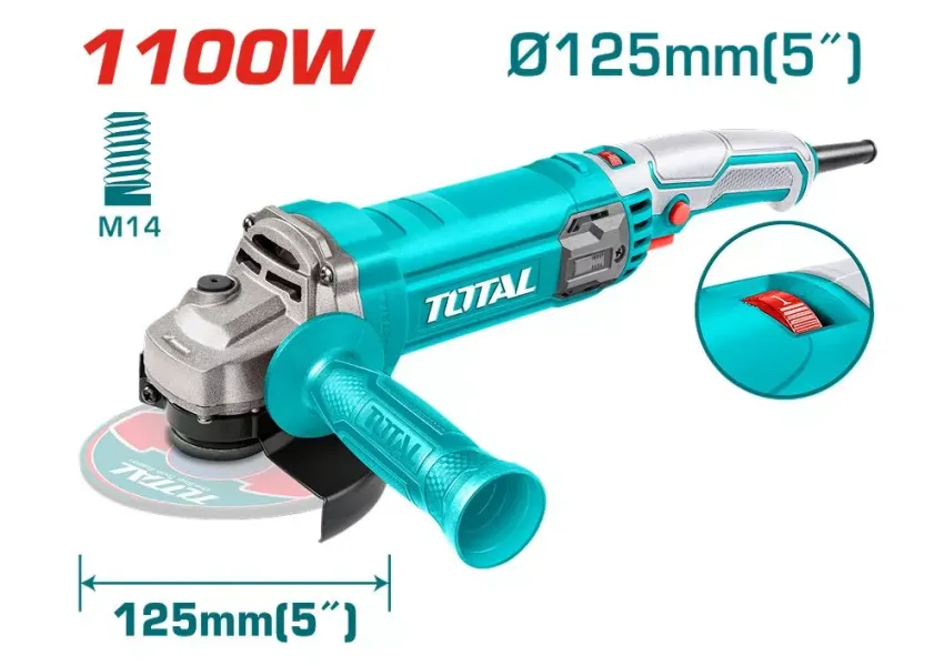 TOTAL TG110125565 անկյունային հղկող մեքենան հուսալի գործիք է տարբեր հղկման և կտրելու աշխատանքների համար։ 1100 Վտ հզորությամբ և 5000-ից մինչև 12000 պտույտների տիրույթով այն ապահովում է բարձր արտադրողականություն և մշակման ճշգրտություն։