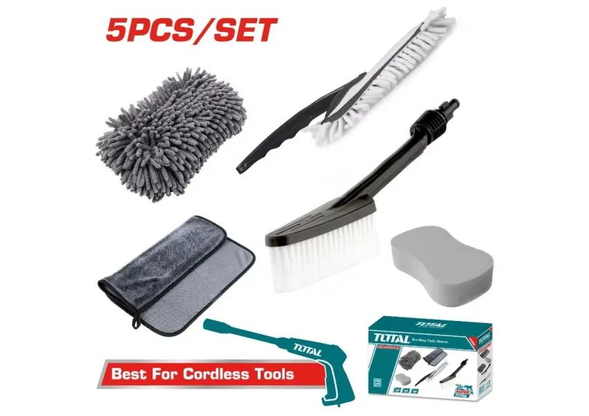Ավտոմեքենայի մաքրող միջոցների հավաքածուն համատեղելի է TOTAL TPWLI4006 բարձր ճնշման լվացող սարքին։ Հավաքածուի մեջ ներառված է 5 հատ պարագա․ - 1 հատ սրբիչ, - 1 հատ ձեռնոց, - 1 հատ սպունգ, - 1 հատ մեքենայի հատակը սրբելու հարմարանք, - 1 հատ խոզանակ։