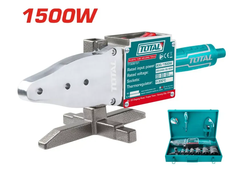 TOTAL TT328151 սարքը լայնորեն կիրառվում է սանտեխնիկական աշխատանքների ոլորտում: Նախատեսված է պոլիպրոպիլենային խողովակների զոդման համար։ Փաթեթում՝ կցորդիչներ (20մմ, 25մմ, 32մմ, 40մմ, 50մմ, 63մմ), չափիչ ժապավեն (3մ), թիթեղի մկրատ, պտուտակահան։
