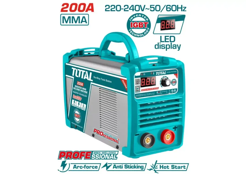 TOTAL TW220038 ինվենտորային եռակցման մեքենան հնարավորություն է տալիս եռակցումն իրականացնել MMA (մեխանիկական աղեղային եռակցում) եղանակով։ IGBT inverter տեխնոլոգիայով համալրված եռակցման սարքն ունի 3 ռեժիմներ՝ ARG-Force (հզորության կարգավորում՝ էլեկտրոդի կպչումից խուսափելու համար), Թեժ սկիզբ (աղեղի հարվածի պարզեցում՝ եռակցման սկզբում հզորության հակիրճ ավելացմամբ), Anti-Stick (սարքավորման անջատում էլեկտրոդի կպչումից)։ Մեխանիկական աղեղային եռակցման առավելությունները. եռակցումը՝ հեշտ գործընթաց, և ցանկացած դիրքով, մաշվող նյութերի նվազագույն փաթեթ։ Մեխանիկական աղեղային եռակցման սահմանափակումները. սահմանափակ մետաղների տեսակներ և հաստություններ, մետաղախարամը մետաղներից հեռացնելու անհրաժեշտություն։ Փաթեթավորման մեջ առկա են՝ 1 հատ սաղավարտ, 1 հատ մետաղական խոզանակ, 1 հատ հողային սեղմիչ՝ մալուխով, 1 հատ էլեկտրոդի բռնակ՝ մալուխով: