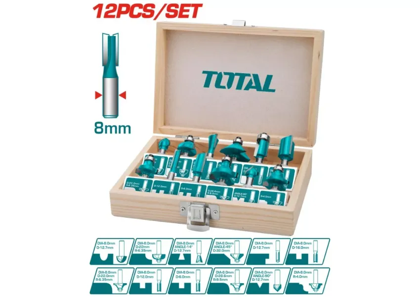 TOTAL TACSR1121 հավաքածուն նախատեսված է դեկորատիվ վերամշակման համար, երբ փափուկ և կոշտ փայտից կտրվում և մշակվում են փայտի կտորները։ Գործիքի օգնությամբ ձեռք է բերվում բարձրորակ մակերես։ Հարմար է TOTAL TR111216 մոդելին։