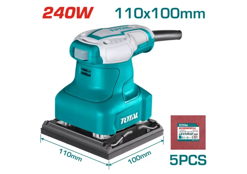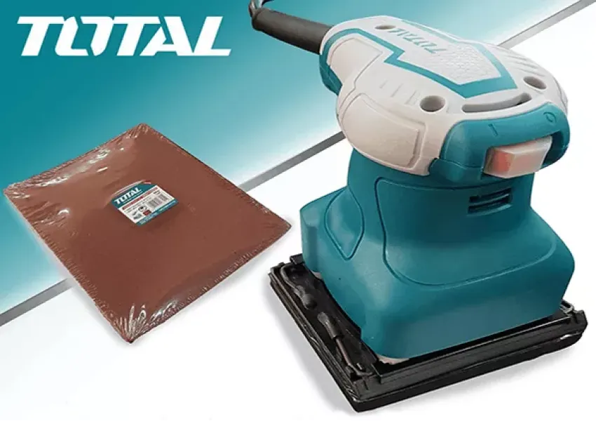 TOTAL TF2231106 հղկող մեքենան առանձնանում է օգտագործման հարմարավետությամբ` իր հարմար ձևի շնորհիվ, որն ապահովվում է գործիքի հուսալի պահպանումը և վերահսկողությունը աշխատանքային գործընթացում: Հզոր շարժիչը ունի մեծ աշխատանքային հնարավորություն, ինչը երաշխավորում է երկար սպասարկման ժամկետը: Ոտնաթաթի փոքր չափը պատասխանատու է դժվար հասնելու վայրերում աշխատելու համար: Հղկող մեքենան նախատեսված է փայտե, մետաղական, պոլիմերային մակերեսների և պատերի ծածկույթների չոր հղկման համար: Այս գործիքը անփոխարինելի է փայտամշակման, ներքին հարդարման, կահույքի արտադրության և վերանորոգման ժամանակ: Աշխատանքային մակերեսին տարբեր հատիկավորության հղկաթերթեր կցելով՝ կարելի է հասնել մանրացման և փայլեցման ցանկալի արդյունքի: Նրա էրգոնոմիկ կառուցվածքը հեշտացնում է բռնվածքը աշխատելիս, իսկ ռետինացված սեղմիչը թուլացնում է ցնցումները: Ուղղակի հովացում համակարգ՝ գերարագ կատարողականության և երկար սպասարկման համար։