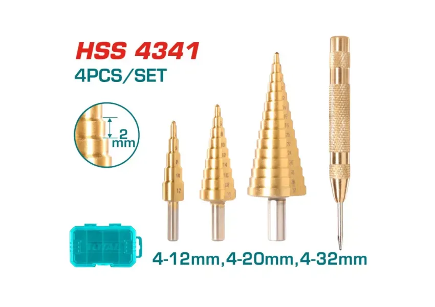 HSS 4341 նյութից պատրաստված կոնաձև գայլիկոնների հավաքածուն ներառում է 3 հատ գայլիկոն, այդ թվում՝ 1 հատ 4-12մմ,2մմ/քայլ, 1 հատ 4-20մմ,2մմ/քայլ, 1 հատ 4-32մմ,2մմ/քայլ։
