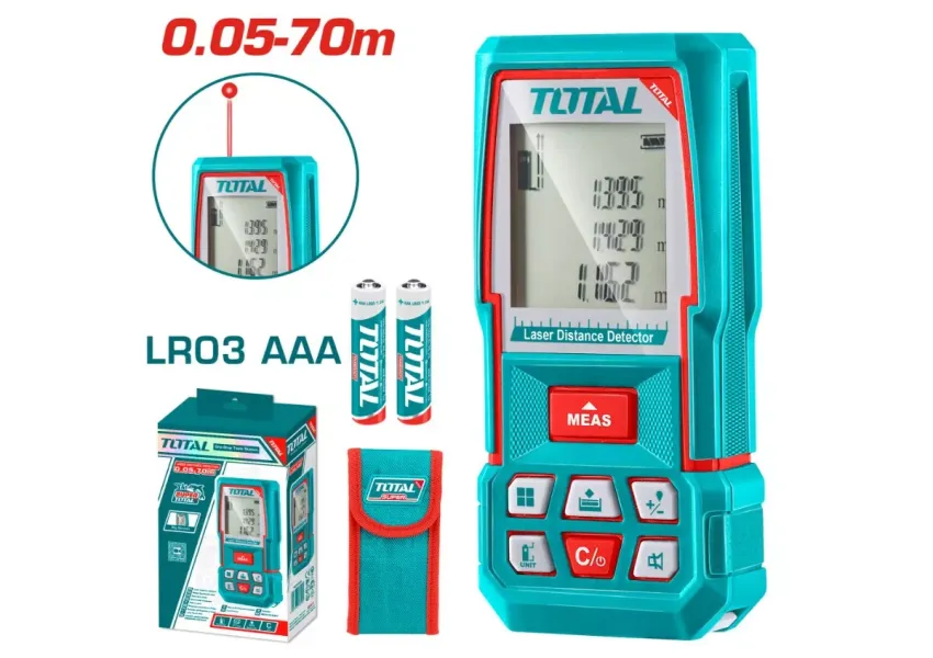 TOTAL TMT57026 635Նմ տարածության լազերային չափիչը հագեցած է հետևյալ գործառույթներով՝ մեկանգամյա չափում, անընդհատաբար չափում, անուղղակի չափում, տարածության չափում, ծավալի չափում, մեկանգամյա չափում՝ ըստ Պյութագորասի թեորեմի, կրկնակի պյութագորասյան գումարած, կրկնակի պյութագորասյան հանած, տարածության կրկնակի չափում։ Չափման միջակայքը՝ 0.05-70մ։ Չափիչն աշխատում է մարտկոցով։ Փաթեթում՝ 2 հատ 1.5Վ AAA մարտկոց։