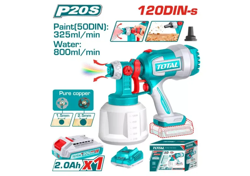 Total TSGLI2001 պրոֆեսիոնալ ներկացիր՝ նախատեսված հարմարավետ և արդյունավետ աշխատանքների համար: էրգոնոմիկ դիզայնը, 1000 մլ տարան ու հոսքի բարձր արագությունը (325 մլ/ր) այն դարձնում են իդեալական տարբերակ՝ տան վերանորոգման և ստեղծագործելու համար: