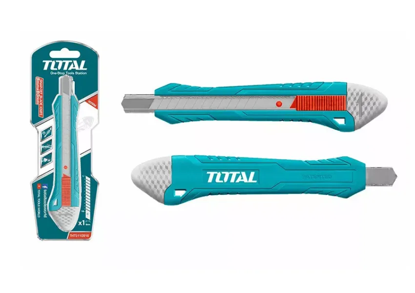 TOTAL THT5110916 ջարդվող սայրով կտրող դանակը հարմար է շինարարական և առօրյա աշխատանքներում թուղթ, պաստառ, ստվարաթուղթ և այլ նյութեր կտրելու համար։ Դանակի սայրը պատրաստված է ճապոնական ածխածնային պողպատից (SK-5)։ Պլաստմասե բռնակը հարմարավետ է բռնվելիս, չի սայթաքում։
