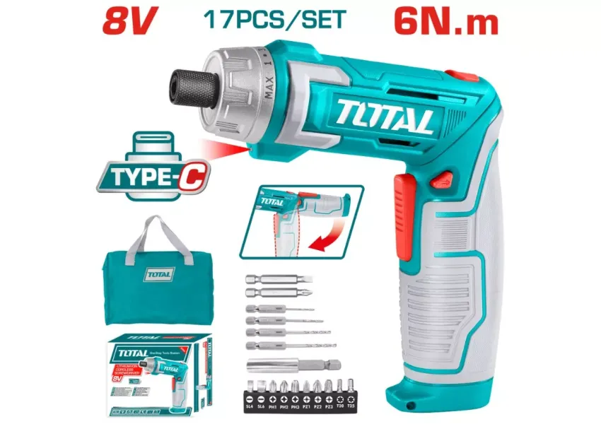 Պտուտակահան մարտկոցային (բիթերով) 8Վ 6Նմ TOTAL TSDLI0802