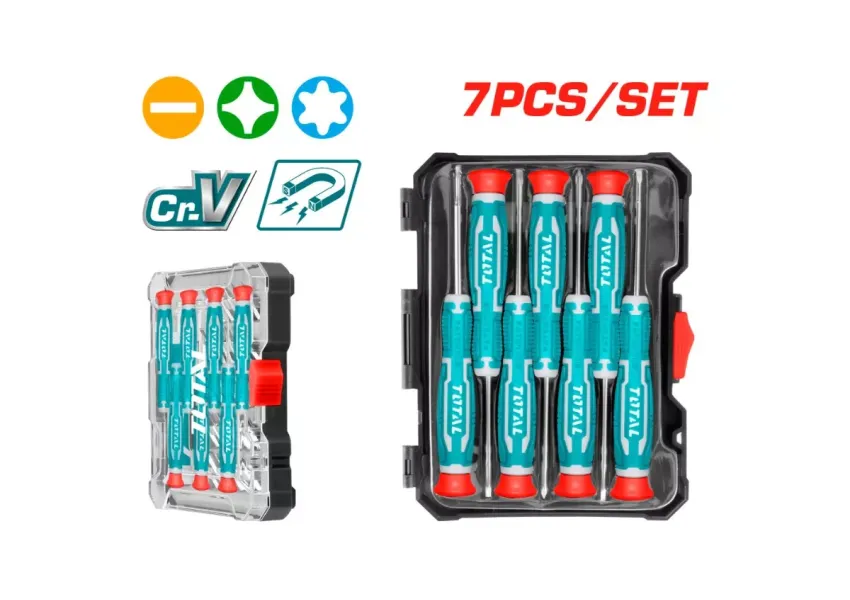 Հավաքածուն նախատեսված է ճշտգրիտ աշխատանքների համար։ Հավաքածուի բոլոր պտուտակահանների բռնակներն էրգոնոմիկ են, հարմարավետ և աշխատելիս ձեռքից չեն սայթաքում: Աշխատանքային հատվածը պատրաստված է քրոմ-վանադիումային պողպատից, որն ապահովում է նրանց երկար շահագործման ժամկետը։ Փաթեթում 7 հատ ճշգրիտ պտուտակահան (SL2.0x50մմ, SL2.5x50մմ, SL3.0x50մմ, PH00x50մմ, PH0x50մմ, T6x50մմ, T8x50մմ)։