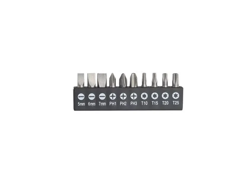 Ճկուն պտուտակահանի բռնակը ջերմապլաստիկ ռետինից է: Մագնիսական հիմքը հուսալիորեն պահում է բիթերը: Հավաքածուն ներառում է 4 հատ 6 մմ ադապտեր, 10 հատ 6․35x25 մմ Cr-V բիթ (տափակ՝ SL5, SL6, SL7, խաչաձև՝ PH1, PH2, PH3, աստղաձև` T10, T15, T20, T25):