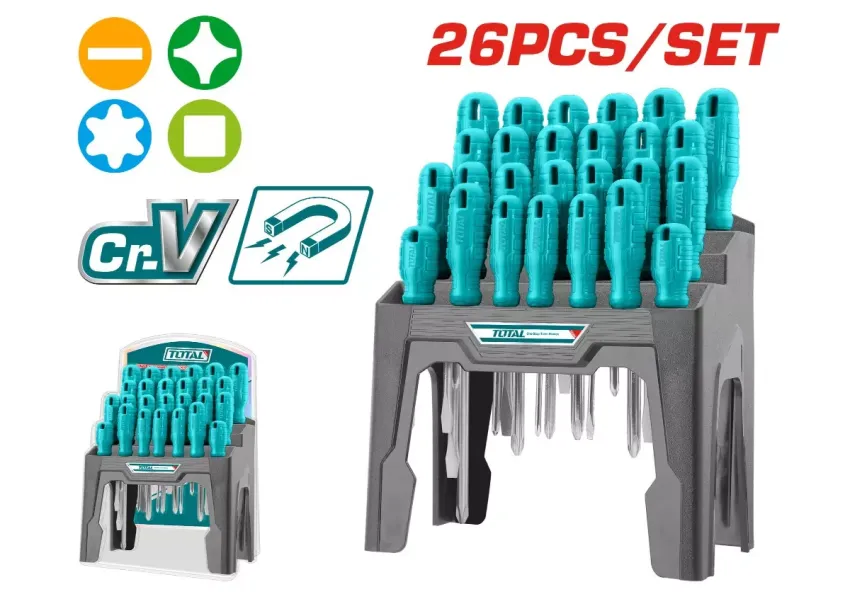 Հավաքածուն ներառում է 26 պտուտակահան տարբեր ձևերով և չափերով։ Գործիքները պատրաստված են ամուր պողպատից՝ երկարատև աշխատանքի համար։