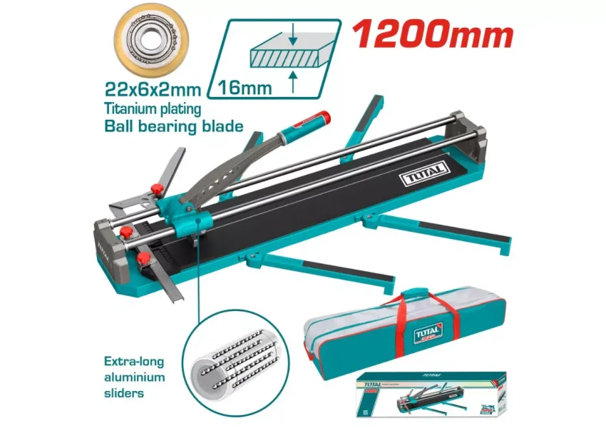 TOTAL THT571201 գործիքը նախատեսված է սալիկի կտրման համար։ Կտրում է ուղիղ և անկյունագծային։ Հարմար է մինչև 1200մմ սալիկների հետ աշխատանքում։ Ծածկույթը պաշտպանված է սահումից։ Գնդիկավոր առանցքակալով կտրող սայրը պատրաստված է վոլֆրամի կարբիդից (ածխածնի և վոլֆրամի միացություն)։