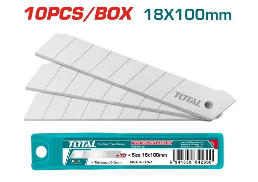 Ջարդվող սայրերի հավաքածուն նախատեսված է ունիվերսալ դանակների համար։ Սայրերը համատեղելի ենTOTAL ապրանքանիշի THT511816, THT511826, THT511836, TG5121806, THT51001 մոդելներին։ Հավաքածուի մեջ՝ 10 հատ։