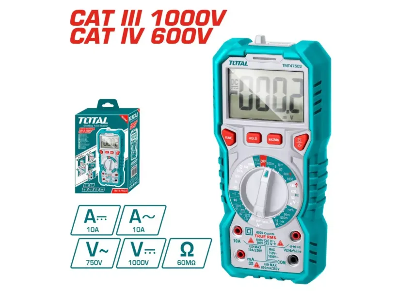 6000 հաշվարկով և իրական միջին քառակուսային ցուցանիշով (True RMS) թվային մուլտիմետրը նախատեսված է տարբեր էլեկտրական պարամետրերի ճշգրիտ չափման համար: Ապահովում է լարման անհպում հայտնաբերում, տարբերակում է ֆազային և չեզոք գծերը: Հագեցած է մշտական և փոփոխական լարման, հոսանքի, դիմադրության, հզորության, հաճախության չափման, ինչպես նաև դիոդների տեստավորման գործառույթներով: Առկա է էկրանի լուսավորություն, մարտկոցի լիցքավորման ցուցիչ և տվյալների պահպանման հնարավորություն: