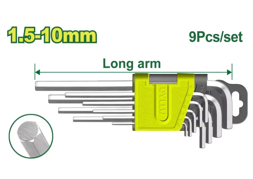 Հավաքածուն ներառում է 9 հատ վեցանկյուն բանալի։ Նյութը՝ քրոմ-վանադիումային պողպատ (Cr-V)։ Չափերը՝ 1.5մմ,2մմ, 2.5մմ, 3մմ, 4մմ, 5մմ, 6մմ, 8մմ, 10մմ։