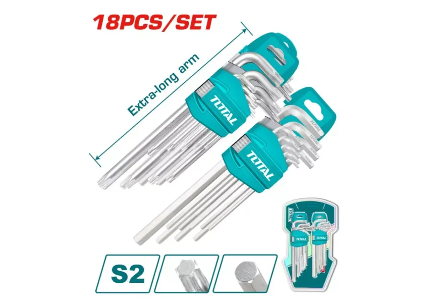 Հավաքածուի մեջ ներառված են 18 բանալիներ, որոնք նախատեսված են տարբեր չափսերի ամրակներով հավաքման և ապամոնտաժման աշխատանքների համար (կահույքի, սարքավորումների): Գործիքները պատրաստված են քրոմ վանադիումի պողպատից, դիմանում են զգալի բեռների և ունեն երկար շահագործման ժամկետ: Բանալիների երկարաձգված ձևը թույլ է տալիս աշխատել նույնիսկ դժվարամատչելի վայրերում: Ներառված է՝ 9 հատ վեցանկուն բանալի (1.5-10 մմ), 9 հատ աստղաձև բանալի (T10-T50):