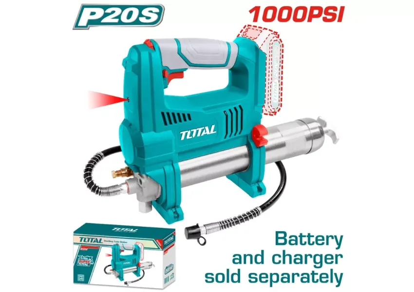 TOTAL TGGLI2010 մարտկոցային քսայուղային ատրճանակը նախատեսված է մինչև 1000 PSI (690 բար) բարձր ճնշմամբ քսայուղի մատակարարման համար: Համատեղելի է P20S (20 Վ) շարքի մարտկոցների հետ: Ունի ալյումինե կորպուս, 760 մմ ճկուն խողովակ և պաշտպանիչ փական: Փաթեթում ներառված է խողովակ: